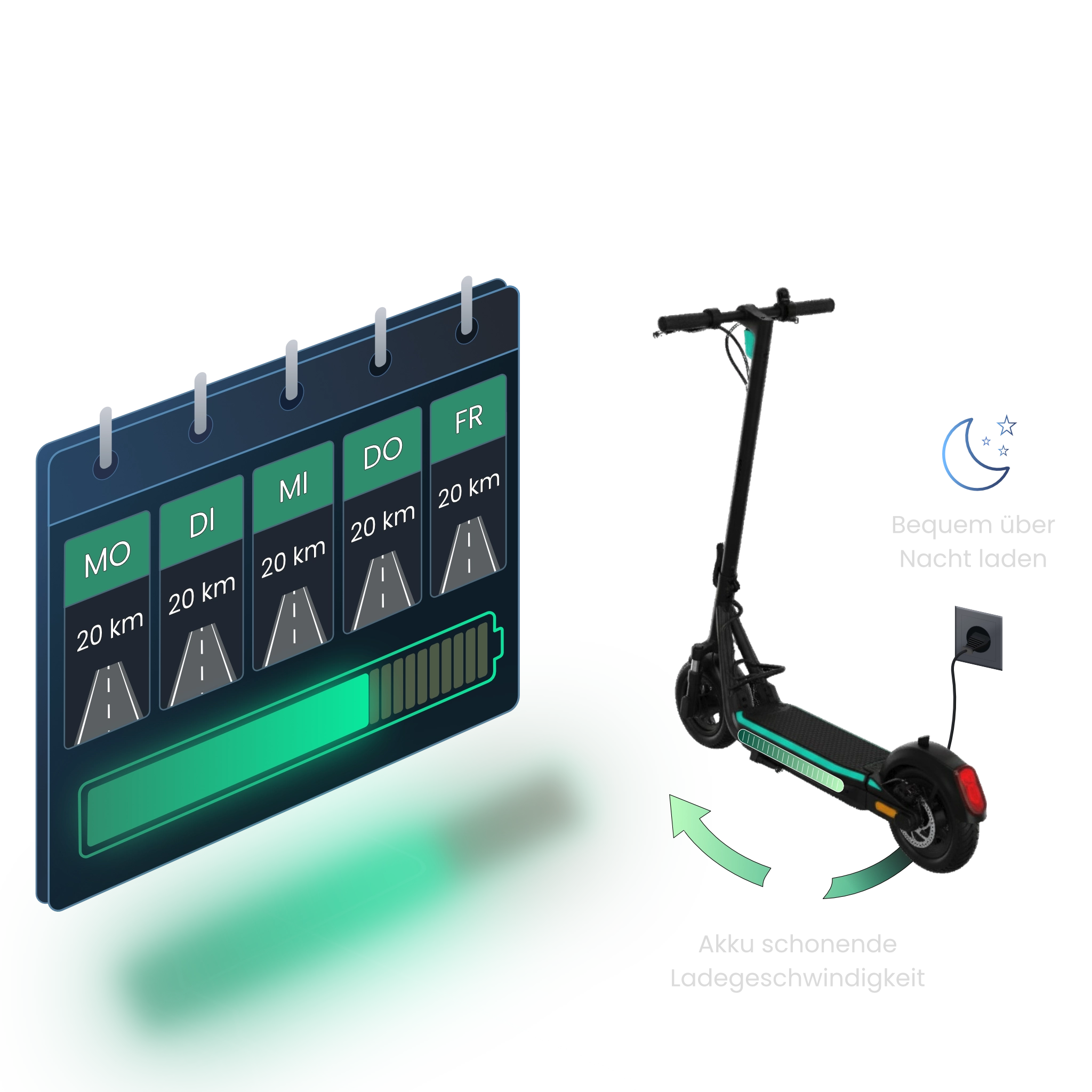 Lädt, während du schläfst: Der Akku lädt bewusst akkuschonend in rund 8 Stunden. Abends einstecken, morgens losfahren. So passt sich dein E-Scooter deinem Tagesrhythmus an, nicht umgekehrt.