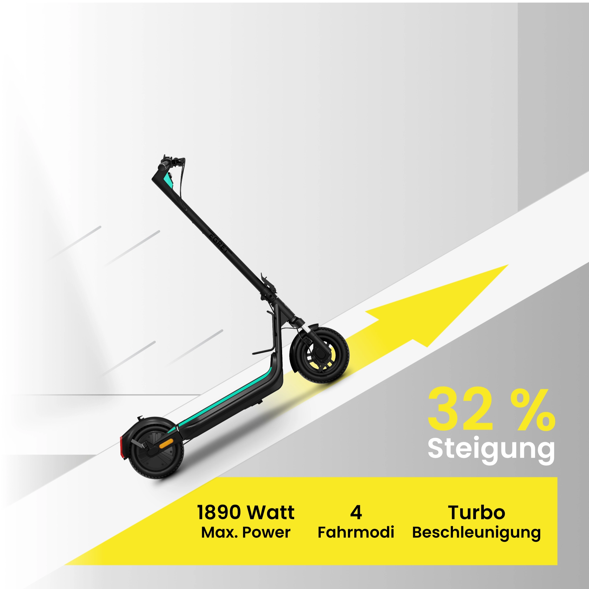 Der Power Boost Motor liefert mit 1.890 W Spitzenleistung und 38 Nm Drehmoment konstant starke Power – auch bei voller Zuladung bis 130 kg und steilen Anstiegen bis zu 32 %. Der Egret Unit bringt Pendler sicher durch den Berufsverkehr, Familien entspannt durch den Alltag und Technikfans auf ihre Kosten.
