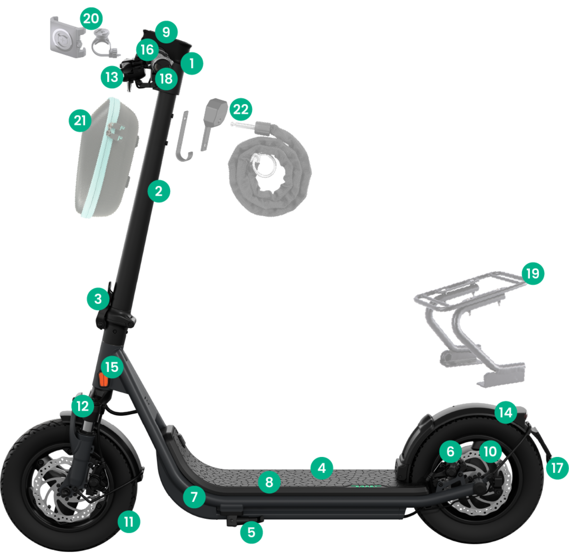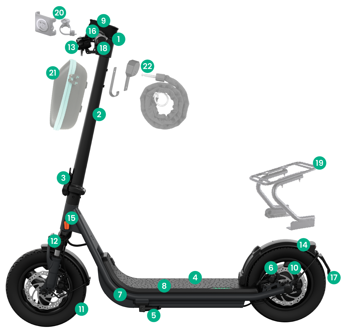 - Lenker: Zum Steuern des Scooters, meist mit Bremshebeln, Gashebel und Display.