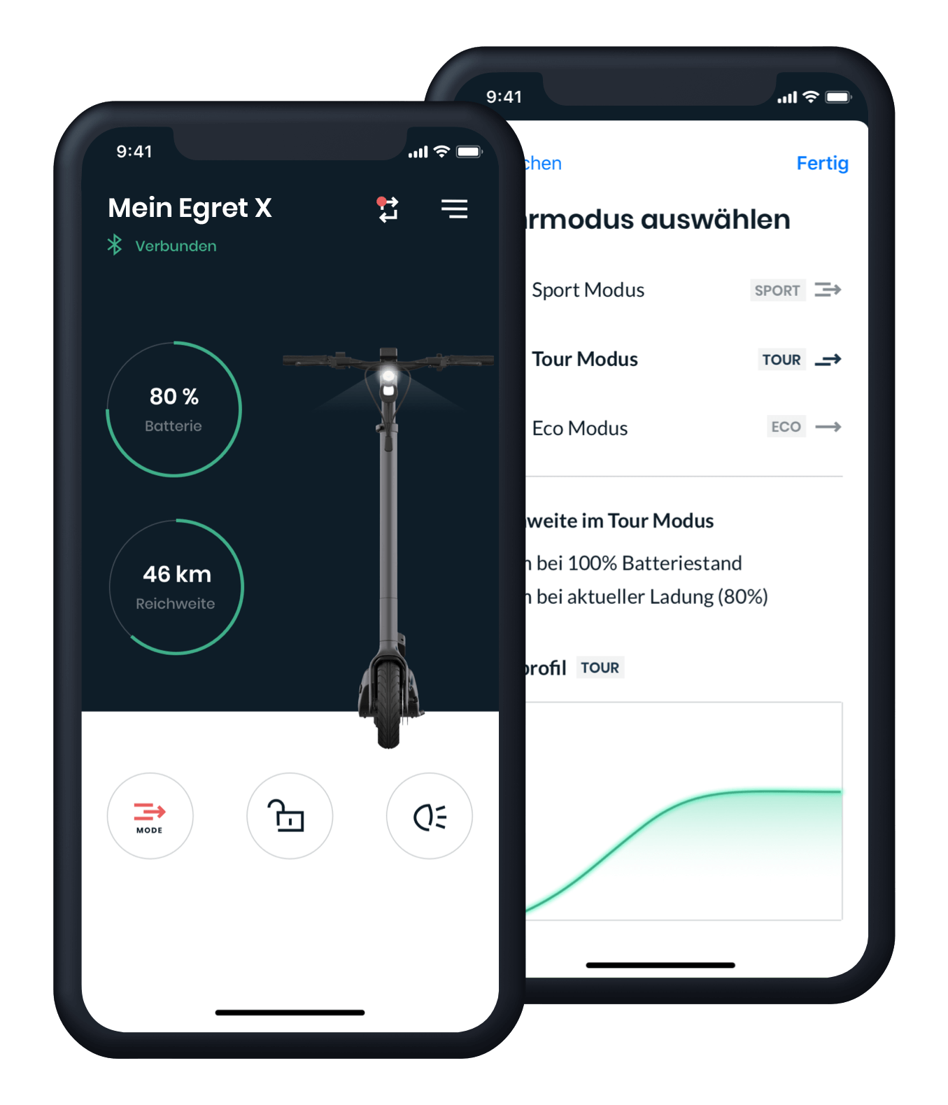 Prüfe die Ladezeit des Akkus. Kenne deine Reichweite. Wechsle den Fahrmodus. Aktiviere die Verriegelung. Nimm Kontakt mit uns auf. Alles für den Egret. Alles in einer App.