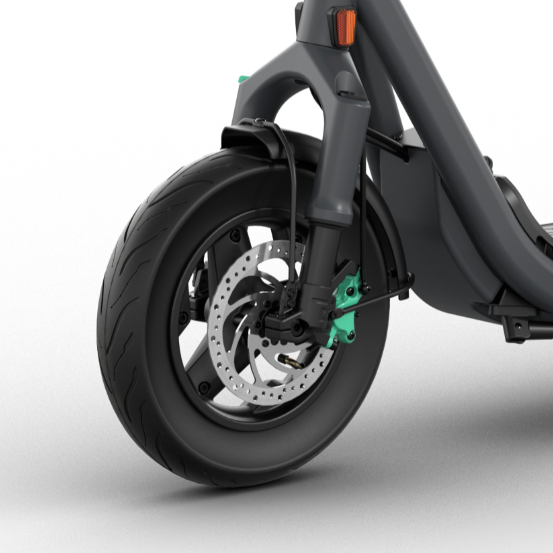 Faster than a classic Egret e-scooter, but at least as safe. Thanks to a state-of-the-art braking system that makes no compromises. With 4 instead of the usual 2 pistons, the 4-piston brake system offers twice as much powerful braking force and precise control, even at high speeds.