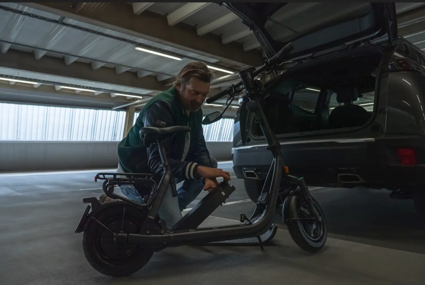 The powerful 48 V quick-change battery under the footboard can be removed in one easy step and charged at any socket.