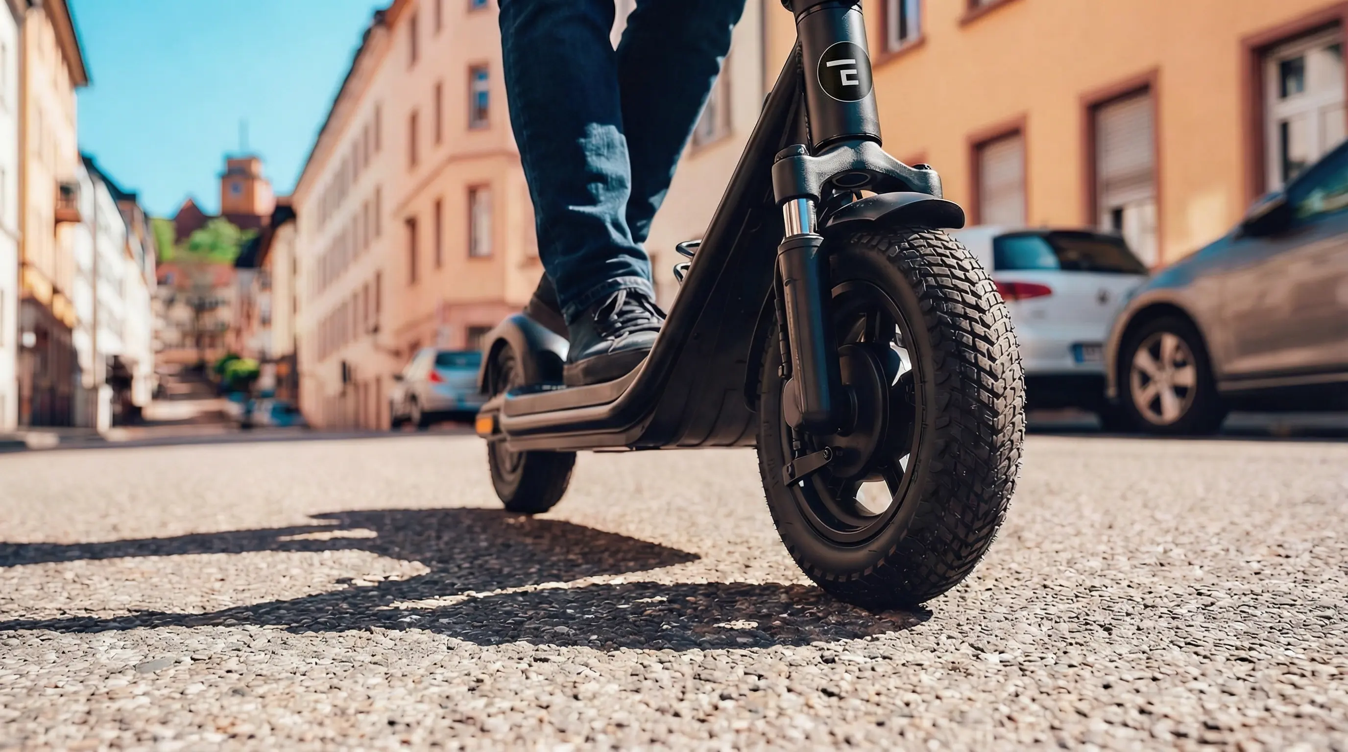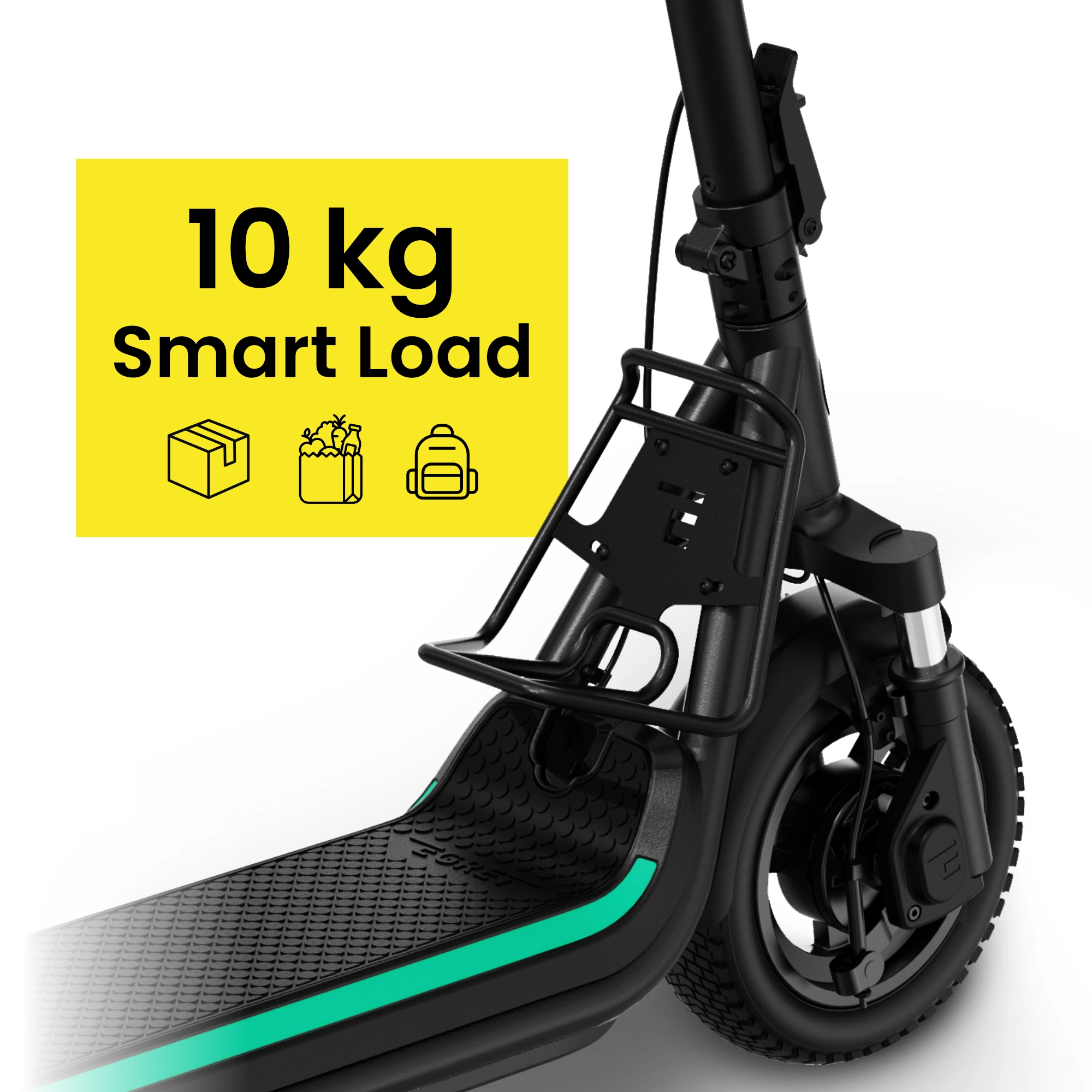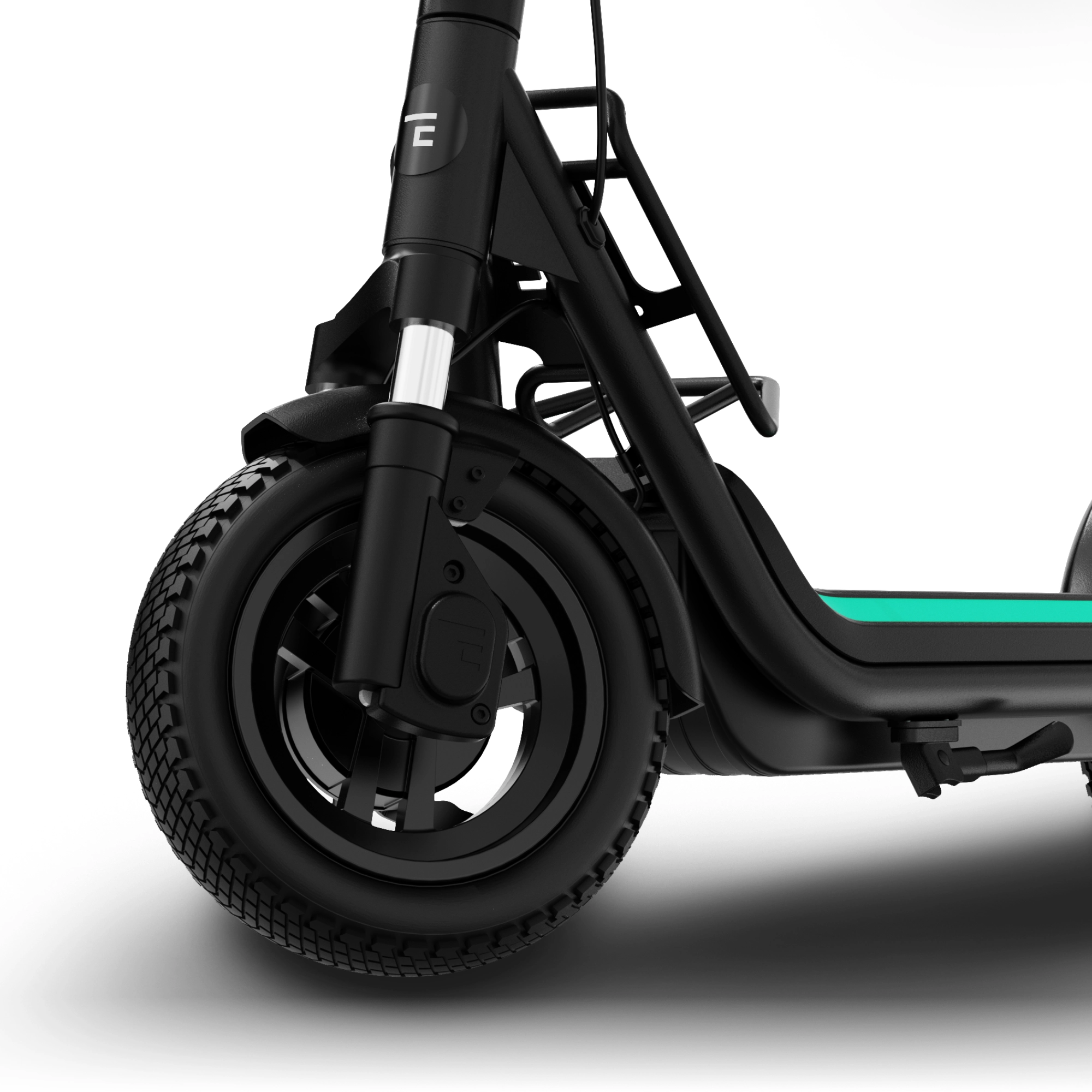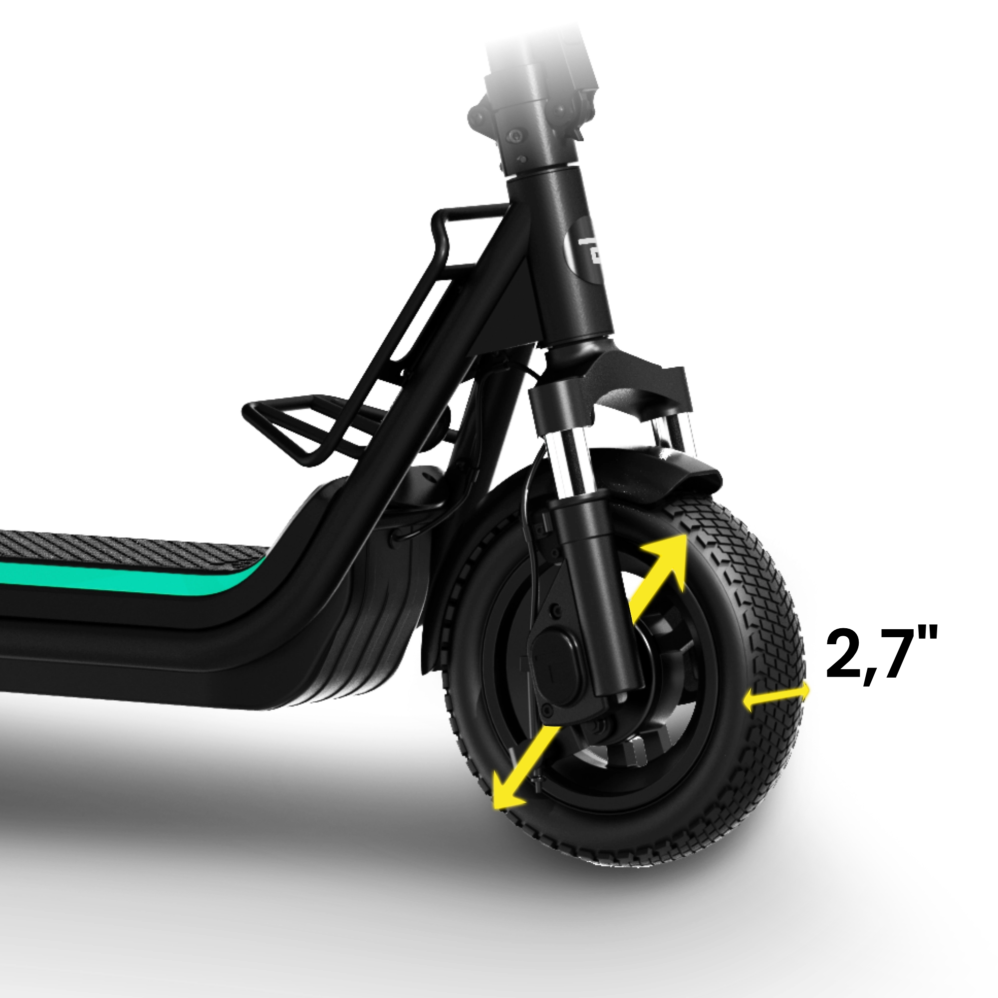 The 10-inch pneumatic tyres with gravel tread keep you steady, delivering reliable traction and smooth handling on mixed terrain. At 2.7 inches wide, these gravel tyres are broader and more robust than standard tyres – perfectly complementing the dual suspension for maximum comfort and control.