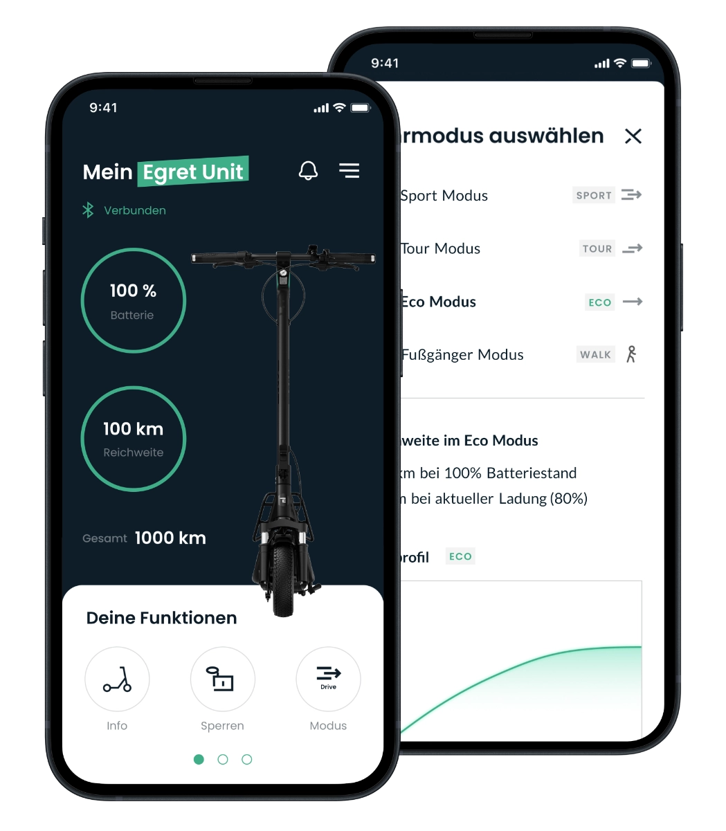 Check the battery’s charge time. Know your range. Change ride mode. Activate the lock. Get in touch with us. All via your Egret. All in a single app.