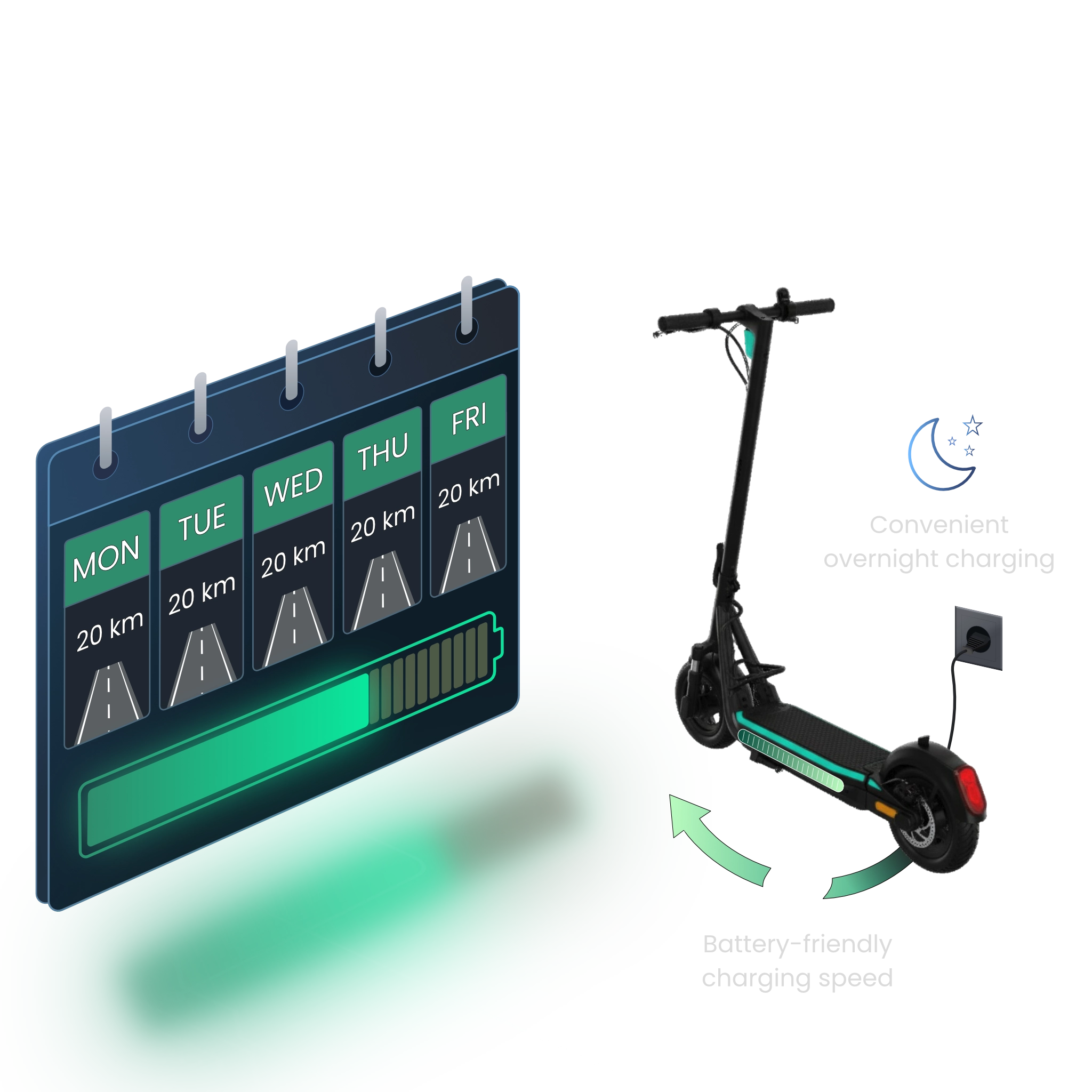 In Eco mode, the 730 Wh battery delivers up to 100 km of range** – ideal for commuters, power users and anyone who relies on daily mobility. Charge while you sleep: the battery recharges gently in around 8 hours to help preserve its lifespan. Plug in at night, set off in the morning. Your e-scooter adapts to your routine – not the other way round.