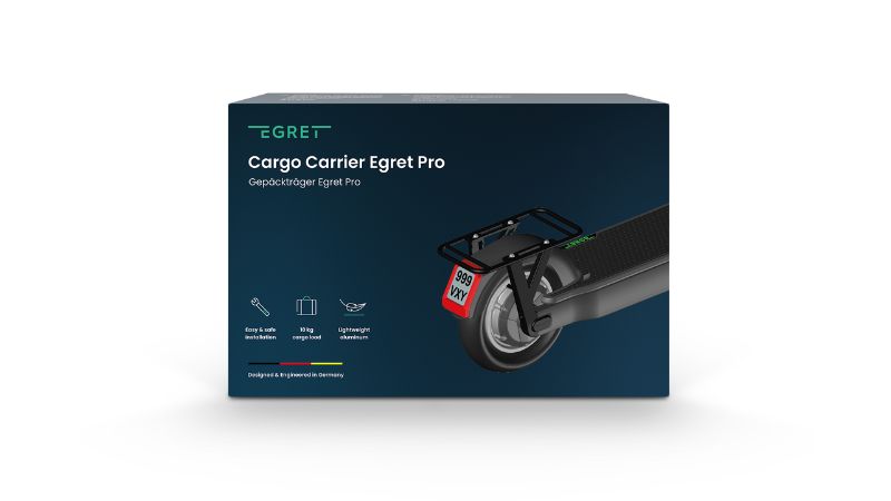 Le montage du porte-bagages arrière est simple et sûr. En montant le porte-bagages sur l'essieu arrière (Egret GT, Egret X | Egret X+ et X series) ou en remplaçant le cache-essieu sur la roue arrière (sur l'Egret Pro et Egret Pro FX), tu peux l'installer sans effort. Le mécanisme de pliage du scooter électrique n'est pas affecté. Le Cargo Carrier, spécialement conçu pour Egret et en Allemagne, est fiable et durable et s'intègre parfaitement au design élégant de ton Egret.