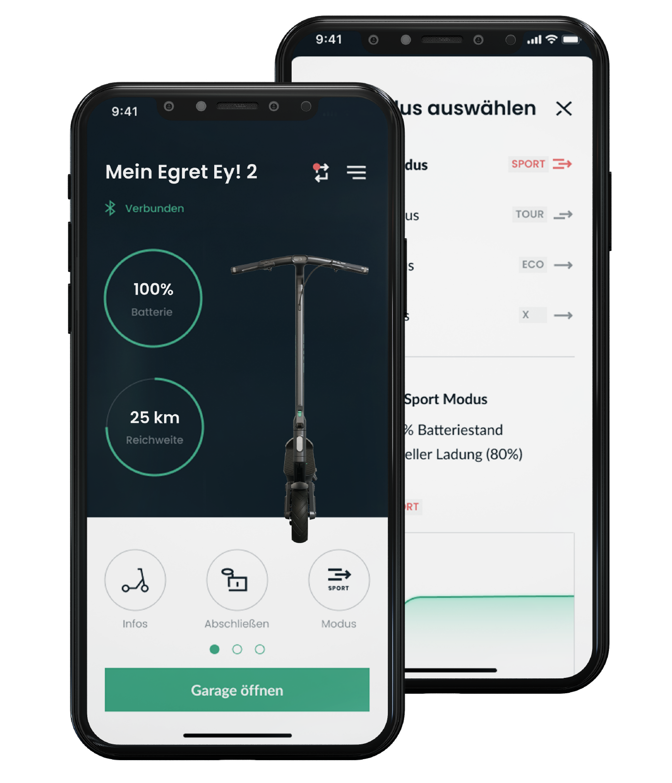Nutze das volle Potenzial deines E-Scooters mit der Egret App. Die aktuelle Reichweite, Akkustatus, Fahrmodi, Wegfahrsperre und Anfragen an unseren Kundenservice lassen sich ganz einfach über die App managen.
