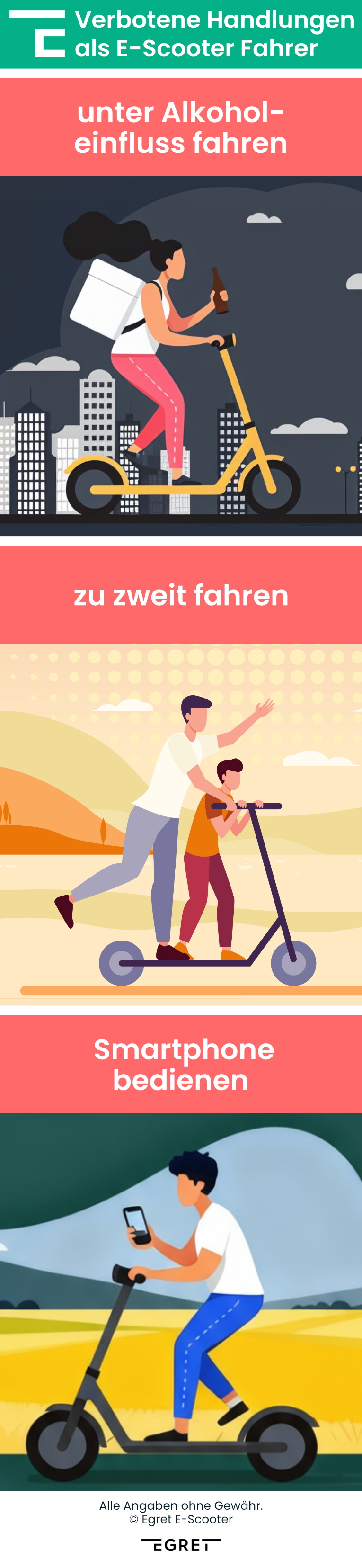 - Kein Alkohol oder Drogen: Mit dem E-Scooter gilt die gleiche Promillegrenze wie beim Auto: Ab 0,5 % wird’s teuer, ab 1 Promille kann sogar der Führerschein weg sein. Drogen sind natürlich ebenfalls tabu.
