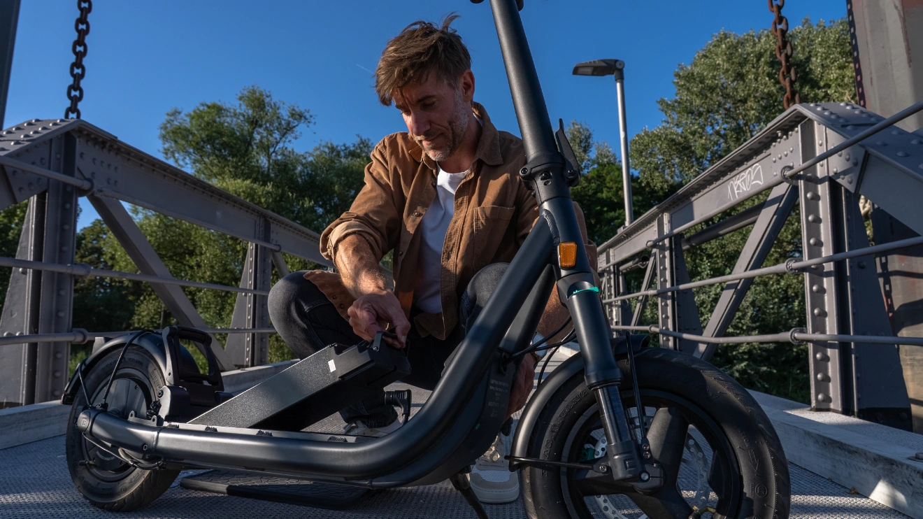 Grâce au système plug & play pratique, la batterie Li-Ion amovible des modèles Egret GT et Egret GTs peut être remplacée en quelques étapes seulement : ouvrez le couvercle de la batterie, retirez la batterie vide, insérez la batterie de rechange chargée, refermez le couvercle et continuez à rouler.